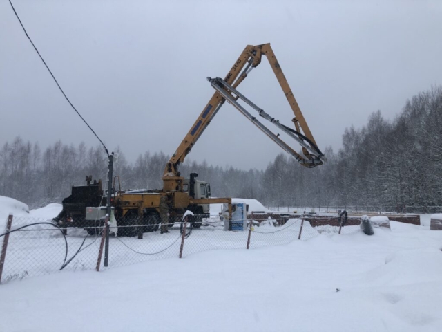 Подготовка бетононасоса к заливке плиты перекрытия цокольного этажа. М.О., Н.-Фоминский р-н. 30 декабря 2022 г.